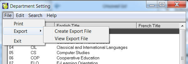 Department Settings can now be exported to a file. To do this, use the menu at the top to select File, Export, Save. Once the file is created, it may be viewed by selecting File, Export, File Export View. The file is in comma delimited format (csv) and includes headers. For hosting customers, if you want to use the file in Excel (as an example), use the View option to find the file and then copy and paste it to a local machine licensed for Excel.