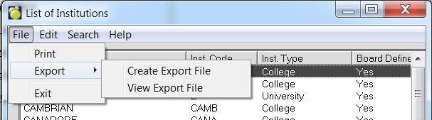 Post Secondary Institutions can now be exported to a file. To do this, use the menu at the top to select File, Export, Save. Once the file is created, it may be viewed by selecting File, Export, File Export View. The file is in comma delimited format (csv) and includes headers. For hosting customers, if you want to use the file in Excel (as an example), use the View option to find the file and then copy and paste it to a local machine licensed for Excel.