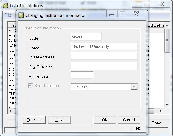 Choose File, Setup, College & University Institutions to access a List of Institutions box. From here you can add, delete or edit an institution's name, number, street address and postal code.
