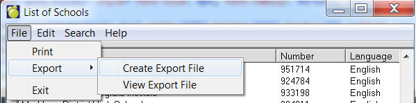 Schools can now be exported to a file. To do this, use the menu at the top to select File, Export, Save. Once the file is created, it may be viewed by selecting File, Export, File Export View. The file is in comma delimited format (csv) and includes headers. For hosting customers, if you want to use the file in Excel (as an example), use the View option to find the file and then copy and paste it to a local machine licensed for Excel.