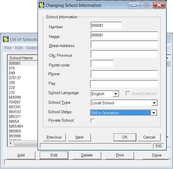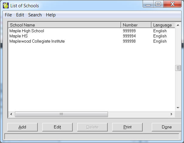 Choose File, Setup, Schools to access a List of Schools box. From here you can add, delete or edit any of the fields on the screen below.
