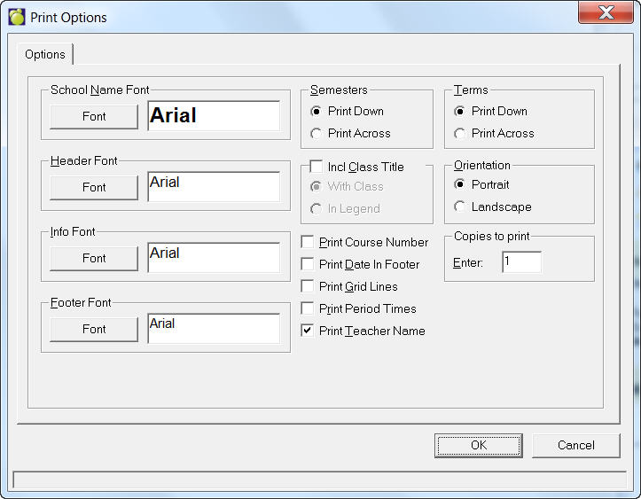 Setup - Click Setup to specify fonts and print layout. Here you can also choose to print Course Number, Date in Footer, Grid Lines and Period Times.