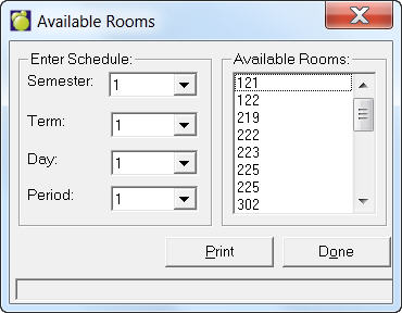 You can see available room information for the current year by choosing File, School Setup, Available Rooms. Enter the Schedule information: Semester, Term, Day and Period. The list of Available Rooms will be automatically generated. To print the list, click Print.
