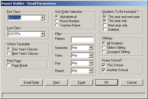- An Email Parameters box will appear where you can specify what student or group of students to print according to the Print Order you selected previously, e.g. If you selected Class (below), then you will be asked to specify the class name, period, etc.