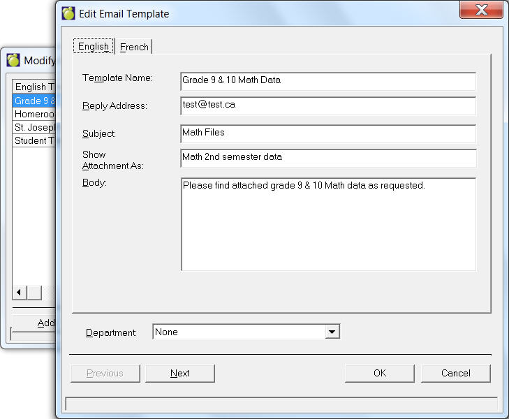 - The Department field pulls from the list of established Departments (File, School Set Up, Departments). This may be useful to help categorize email templates.