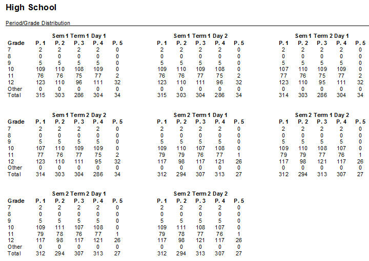 To print Period/Grade Distribution Lists, choose Scheduling, Period/Grade Distribution Lists. A list will be compiled automatically and you'll see a preview similar to this one: