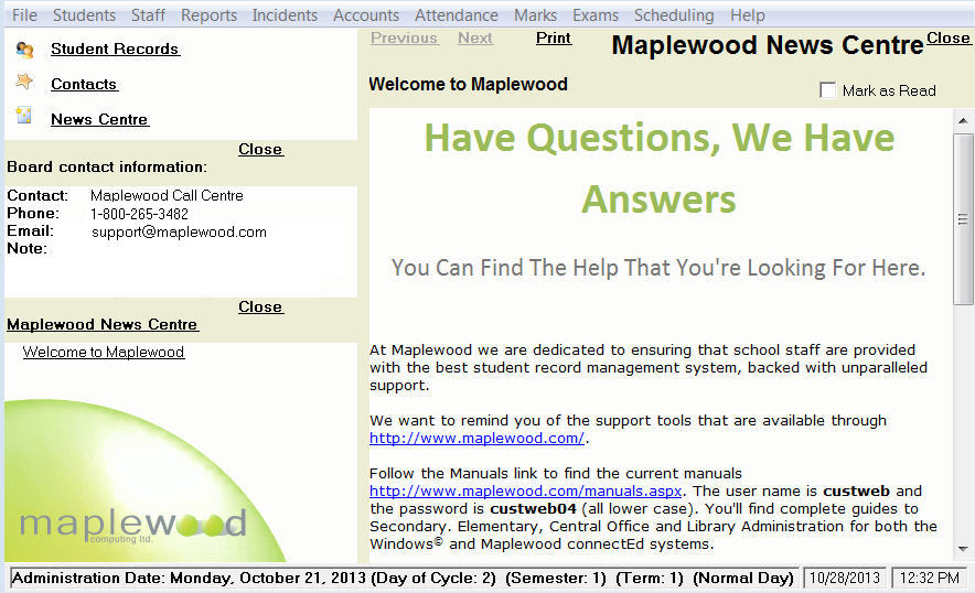 When you first start Maplewood, you will see Contact and News Centre articles. Move through the articles by using the links. To close the right panel, click Close. If you click Mark as Read, the links in the left frame will turn light gray as an indication.