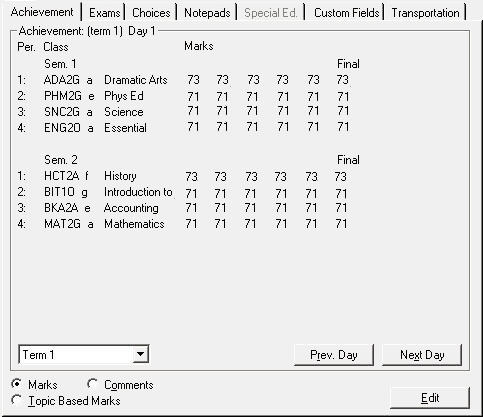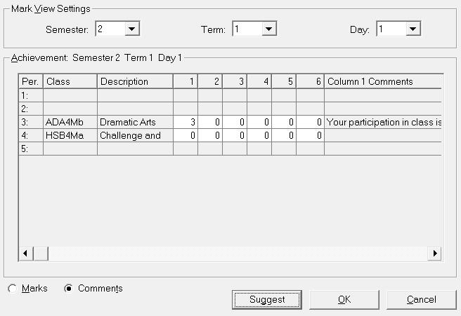 Use the Prev. Day and Next Day buttons to see next and previous days' achievements. From this screen you can move between Marks and Comments by clicking the option buttons at the bottom of the box. Highlight the achievement value that you want to change and enter a new one. You cannot change Course Names or Descriptions here.