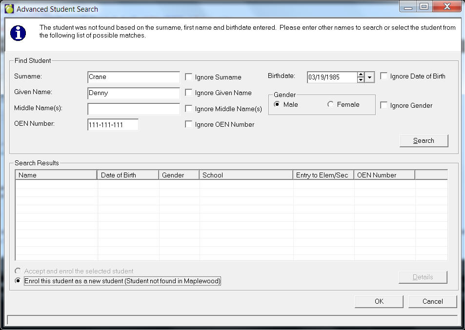 Examine the Search Results to see if one of the close matches could be the desired student. May also expand the search by opting to ignore Name, Birthdate or Gender to find additional potentially matching students.