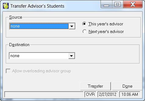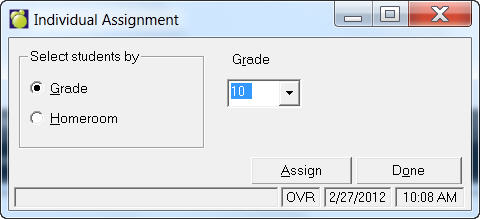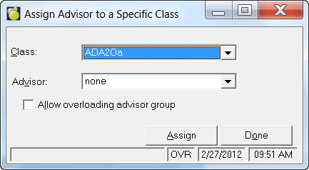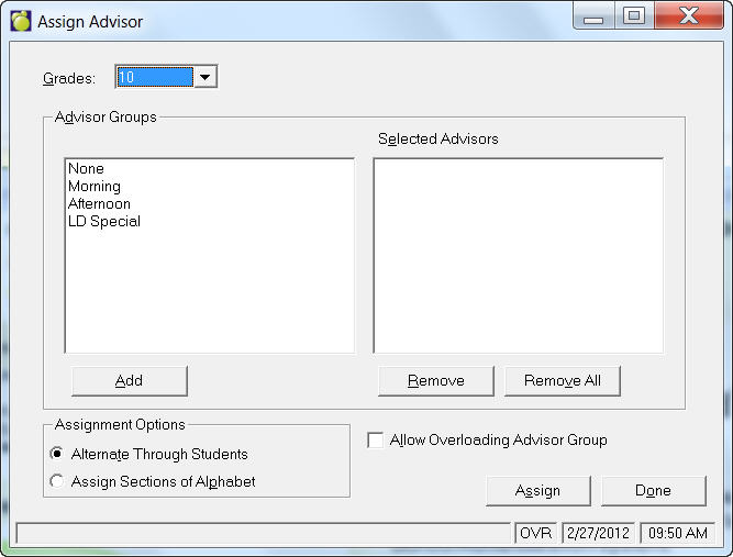 This option is used to place students in an Advisor Group that you have set up under File, School Setup, Advisor Group. To assign student to an Advisor Group, choose Students, Assign Advisor Groups. You have a choice of four assigning methods: