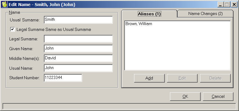 Alias Names - From the Name button in the student's record, Alias Names may be recorded for a student. Alias names are other names by which a student may be referred.