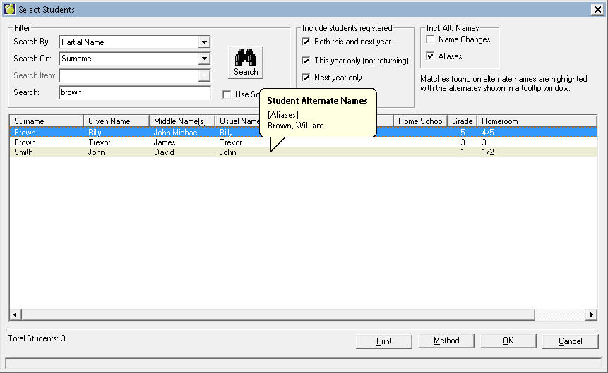 When searching student records, a school may optionally select to include alias names in the search. For example, John Smith may have an alias name of William Brown. If the user checks the Alias option (in the new Incl. Alt. Names frame), and if the user searches for the surname Brown, the list of students will include John Smith. John Smith's row will have a shaded background to highlight to the user that the student was found because of a match on the alias name. When the mouse is positioned on that row, a caption will appear showing the student's matching alias name(s).