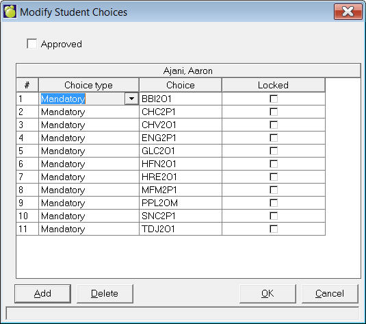 Add - click Add and make a selection from the list. Sections of the class are available by clicking in the Choice box and using the drop-down list that appears. To change a Choice Type click in the cell and make a new selection from the drop-down list (Mandatory, Elective or Alternate).