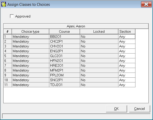 Approved Checkbox: Use this checkbox to approve Student Choices. Once checked, the approval date and user are time stamped into the program.