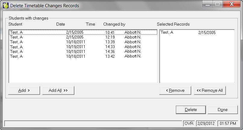 If you chose to keep the student in the Timetables Changes file (by clicking No), or if there are student's whose timetables you changed, they will show up in the list of this window. It is a good idea to print any of the timetable changes information needed using, Print Timetable Changes and Notifications (see above) before deleting the student from this file.