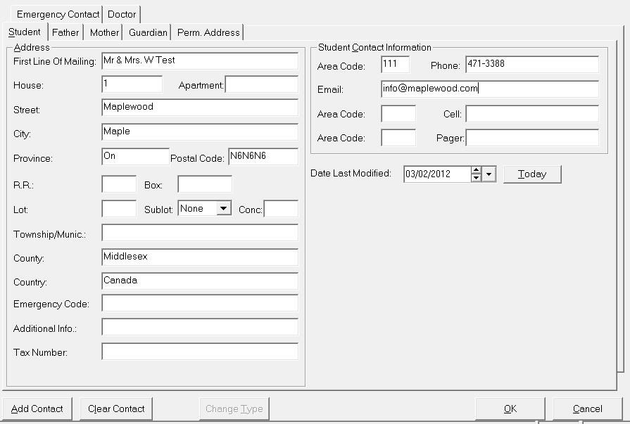 Use the Student, Father, Mother, Guardian, Perm. Address, Emergency Contact and Doctor tabs to complete the student's family records. There is also an Additional Information area for other pertinent family information such as e-mail address, cell, pager, and permanent address.