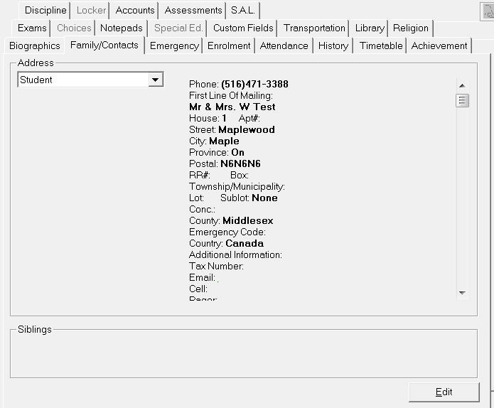 The Edit Parents program now allows the entry of 12 digits, numbers and letters, into the postal code field. Some schools have students whose address and parent/guardian addresses are not in Canada, e.g., students from Asia have postal codes that are all alpha or alpha numeric, but not the same format/order as Canadian postal codes.