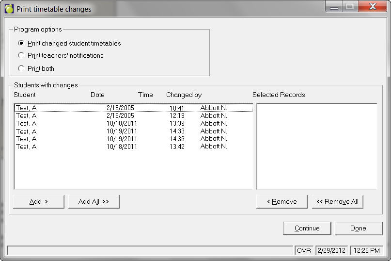 The students whose timetables have been changed will appear in the Student with Changes list. You can select the records by choose the Add All > button or individually using the Add >> button. You can also remove records if selected by mistake. In the above example picture, two students have been chosen and both their new timetables and teacher notifications will be printed.