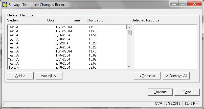 If you have deleted records which should not have been deleted, use this option to salvage them. Choose Students, Print Timetable Changes, Salvage Records. All records that have been deleted using Delete Record of Changes (see above) will show up in this list.
