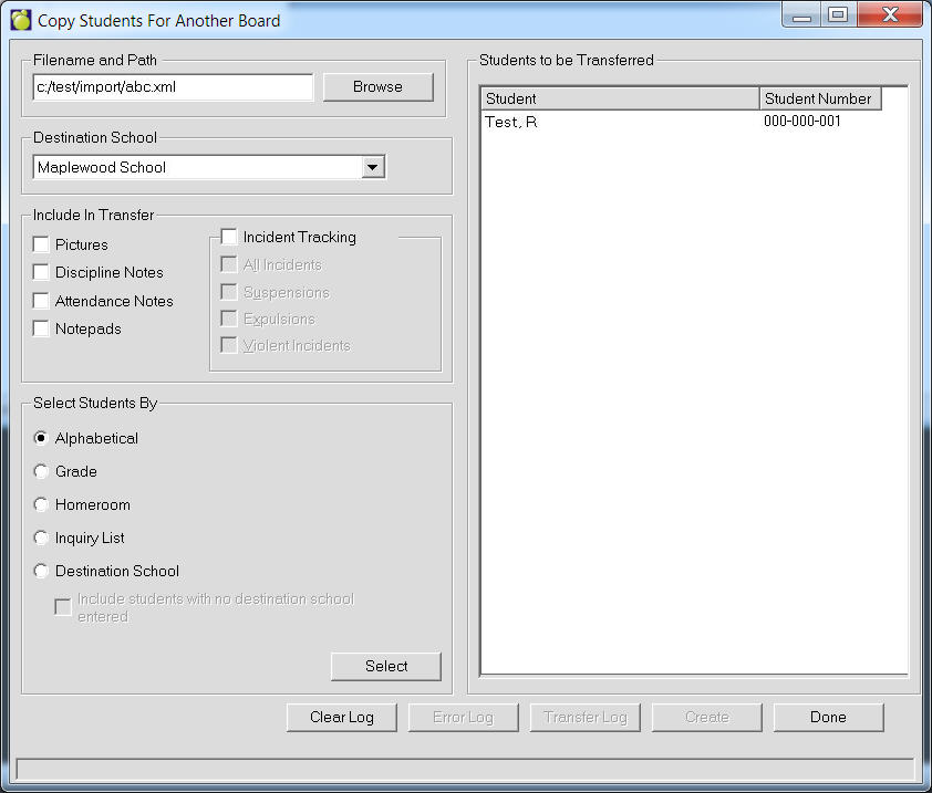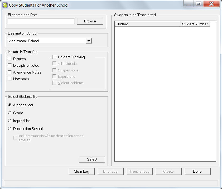 Incidents - When creating a Copy for transfer for Past or Current student, the program will only include the incidents that were selected - All, Suspensions only, Expulsions only, Suspensions and Expulsions, or Violent Incidents.