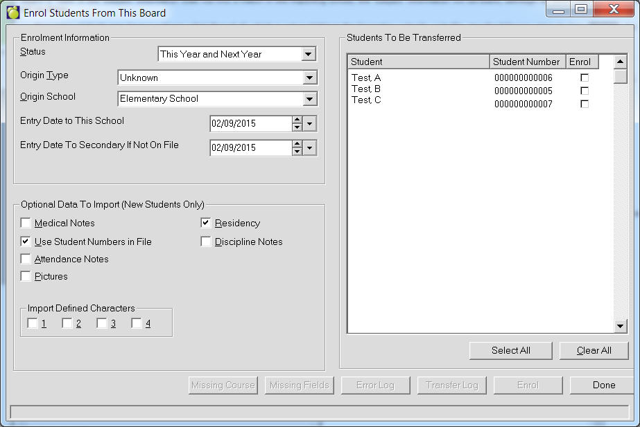 This will take a file (created by another school using Copy Students For Another School) and allow you to enrol some or all of the students directly into your school. "This application is used to enrol students from a file sent from another school. Select a file to enrol the students from. Once a file is selected it will display the students whose records are in the file. You can select the Special Ed. Custom Fields and Custom Fields that you wish to import by selecting appropriate button. Select enrolment information and then click Enrol."