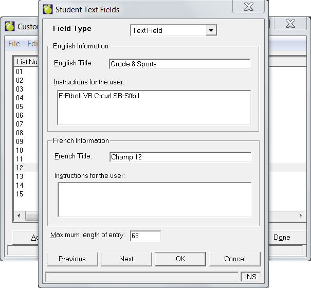 Select a field from the list and click Edit. If adding a new Text Field, Add. To print a copy of the Text Fields, click the Print button. Here is an illustration showing a Grade 8 sports text field.