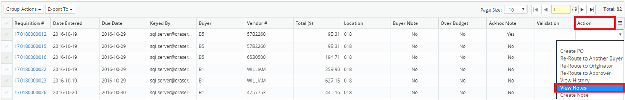 3. Click on the Action drop-down menu beside the corresponding requisition and select View Notes.
