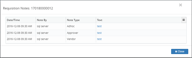 4. All requisition's notes will be displayed in a grid format in the Requisition Notes dialog box. Click on the Close button to return to the Buyer's In-Basket screen.