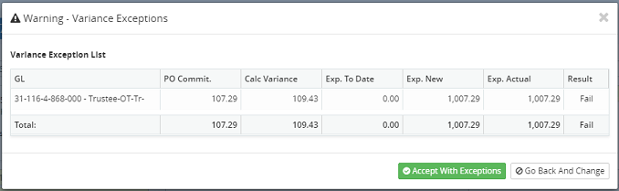 1. Click on the Accept With Exceptions button to continue with the variance and create the invoice or click on the Go Back and Change to make changes to the invoice.