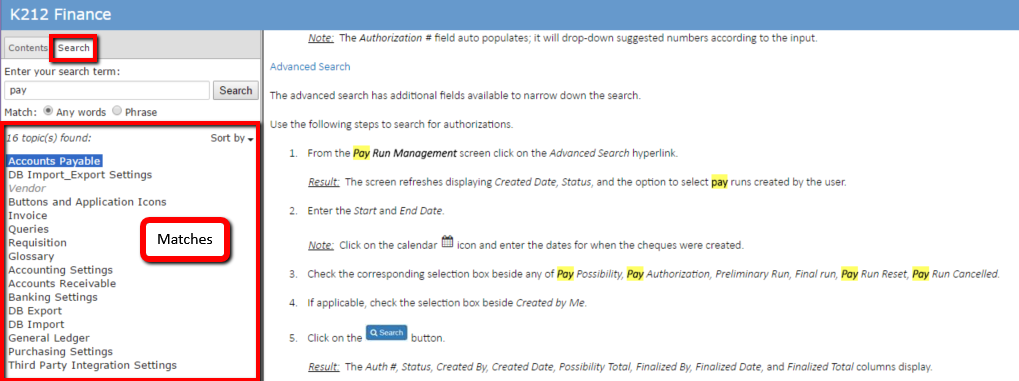 Matches related to the search criteria entered will display, below. Click on any of the topics that best matches the search criteria. All words that match the search criteria will be highlighted in yellow.