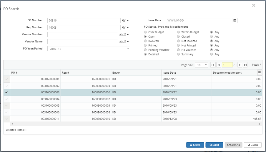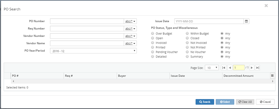 Note: Click on the Clear All button to remove all input information and reset the fields to their default values, or click on the Cancel button to cancel the PO search process.