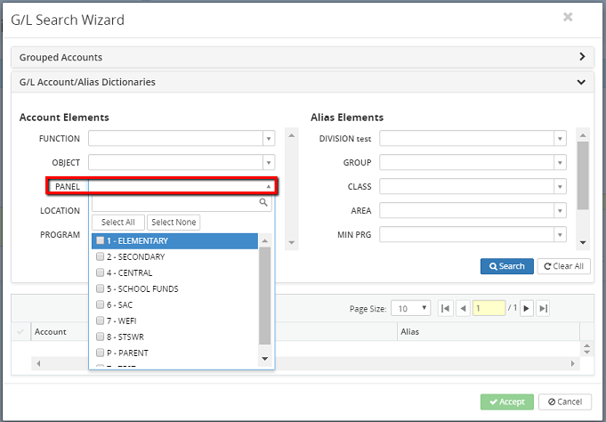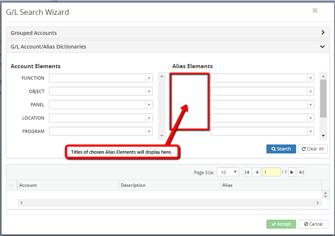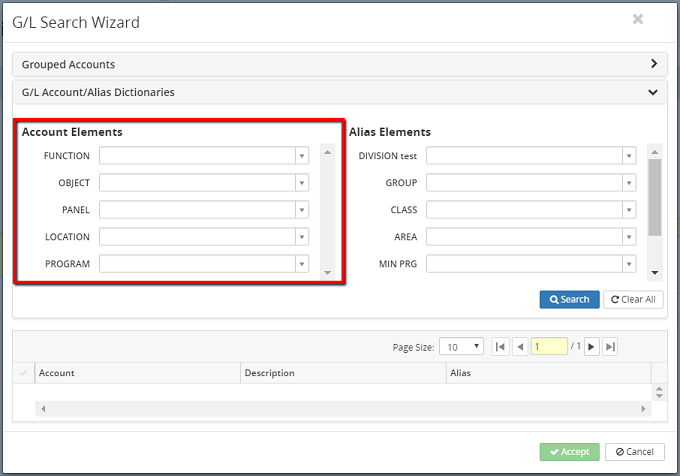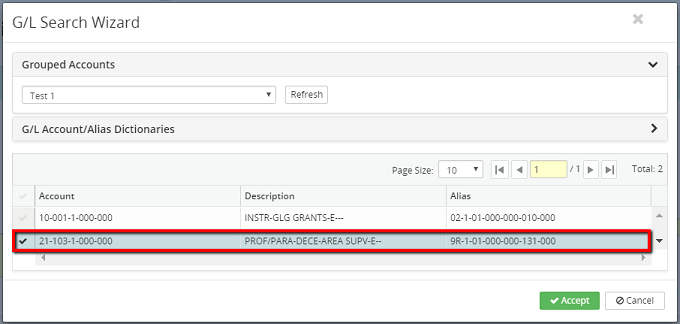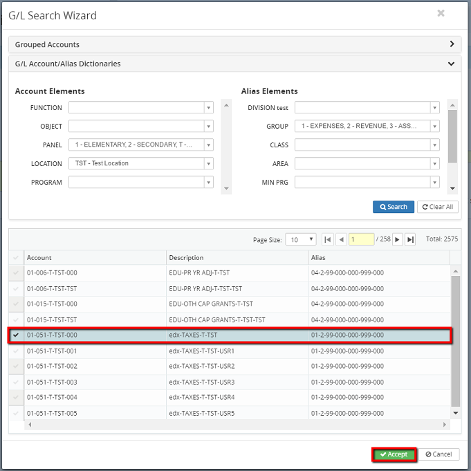 5. Click on the Accept button or click on the Cancel button to cancel the G/L search wizard process.
