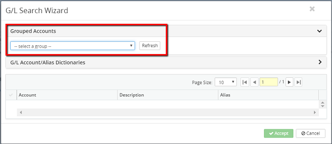 Note: Some G/L Search Wizard dialog boxes will have an Accept All button, use this to select all options within the grid, if required.