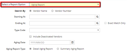 2. Click on the Select a Report Option drop-down menu and select Aging Report.