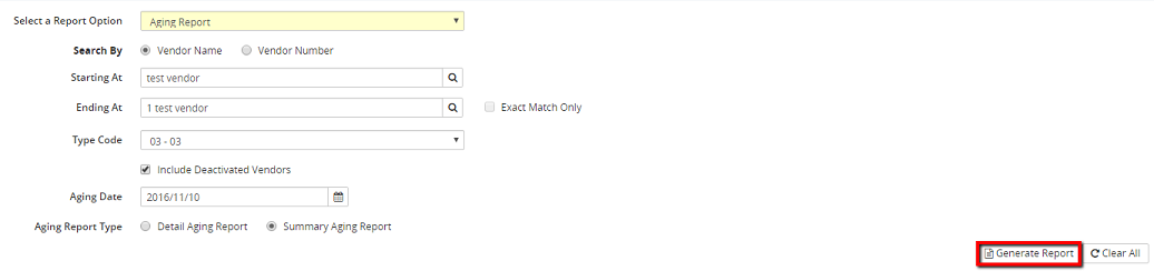 The Summary Aging report includes the Vendor Number, Vendor Name and Totals (by aging periods).