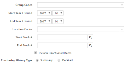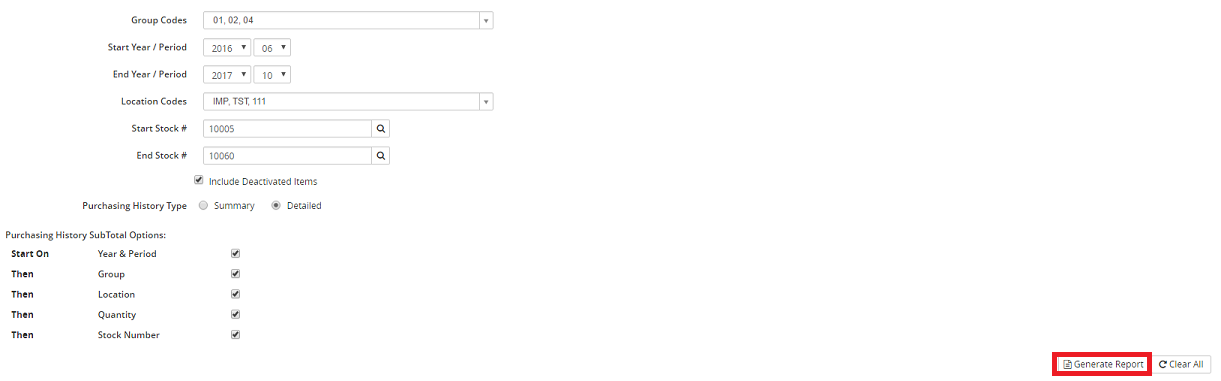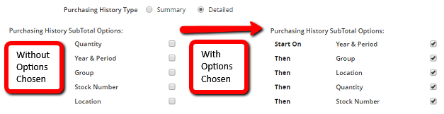 Note: If Detailed radio button is selected, Purchase History Subtotal Options will appear allowing the user to organize the subtotals in the desired order.