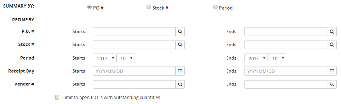 2. If applicable, in the Summary By section, select one of the following radio buttons: PO # (selected by default), Stock # or Period.