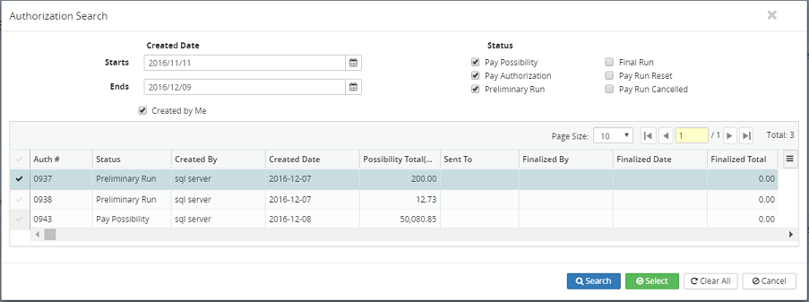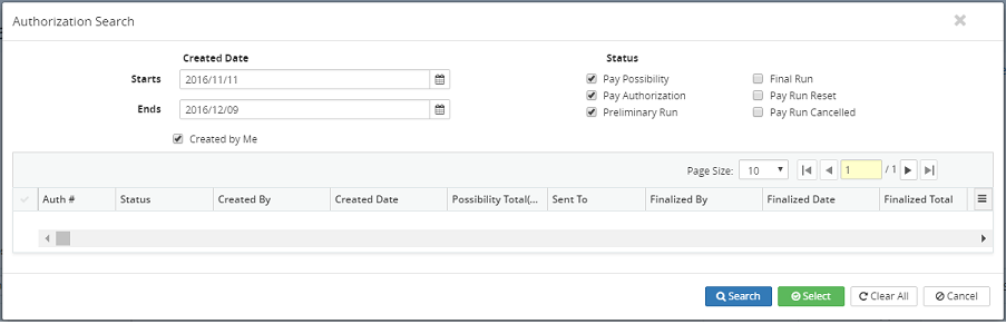 Note: Click on the Clear All button to remove all input information and reset the fields to their default values or click on the Cancel button to cancel the authorization search process.