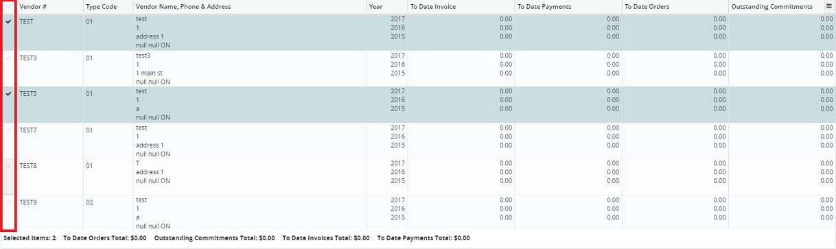 9. In the Reactivate Multiple Vendors Report screen, select as many or as few vendors from the results displayed in the grid, by clicking the corresponding check mark beside the account(s), or click the check mark at the top of the grid to select all vendors.