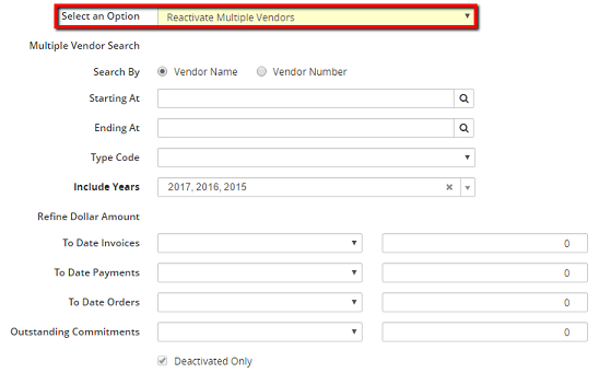 2. In the Select an Option drop-down menu and select Reactivate Multiple Vendors.