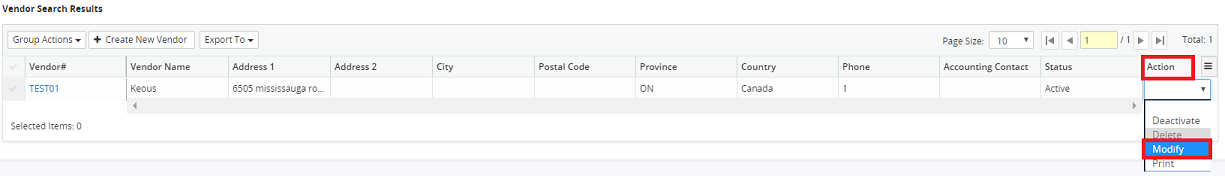 4. Click on the Action drop-down menu beside the corresponding vendor and select Modify.