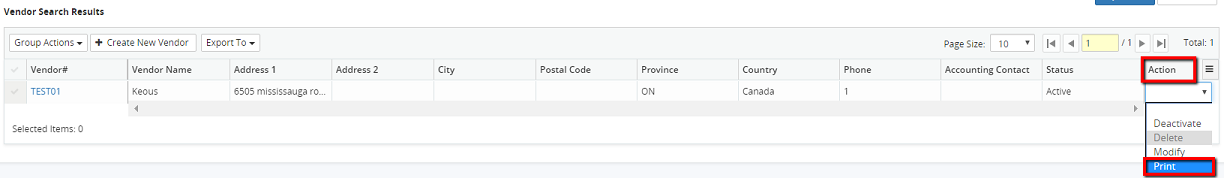 4. Click on the Action drop-down menu beside the corresponding vendor and select Print.