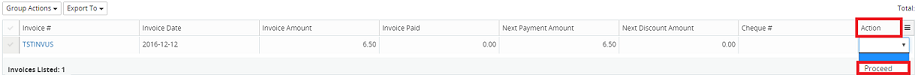 1. Click on the Action drop-down menu beside the corresponding invoice and select Proceed. A confirmation message will display, advising that the A/P cheque creation was successful.