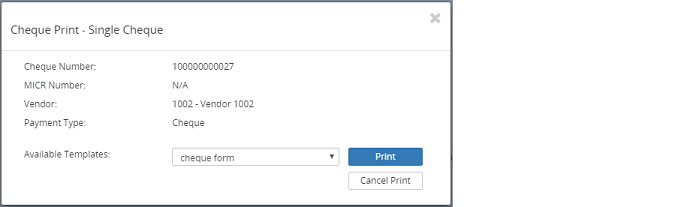 5. If applicable, in the Cheque Print- Single Cheque dialog box, click on the Available Templates drop-down menu to select an alternative option.
