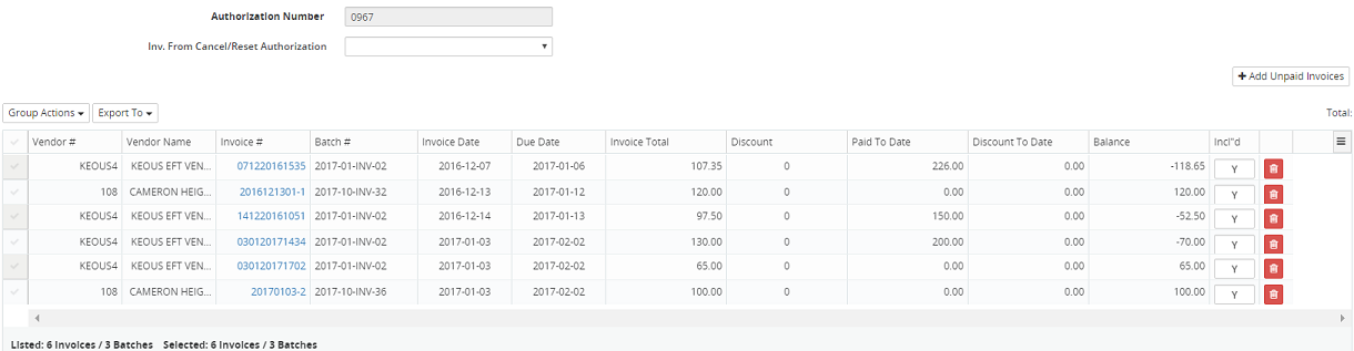 Note: All invoices included in the pay run will display a "Y" in the Incl'd field. Invoices with unbalanced batches, if any, will not be included in the pay run and an "N" will be displayed in the Incl'd field.