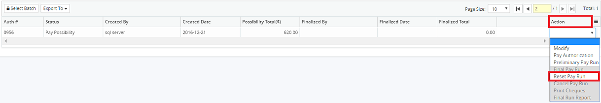 Only a Pay Run that has not completed the Final Pay Run step of the Accounts Payable process can be reset. This will remove the invoices from the authorization batch; they will become available to be included in a new pay possibility. The authorization batch number of the reset pay run will not be reused.