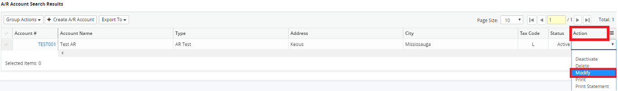 4. Click on the Action drop-down menu beside the corresponding A/R account and select Modify.