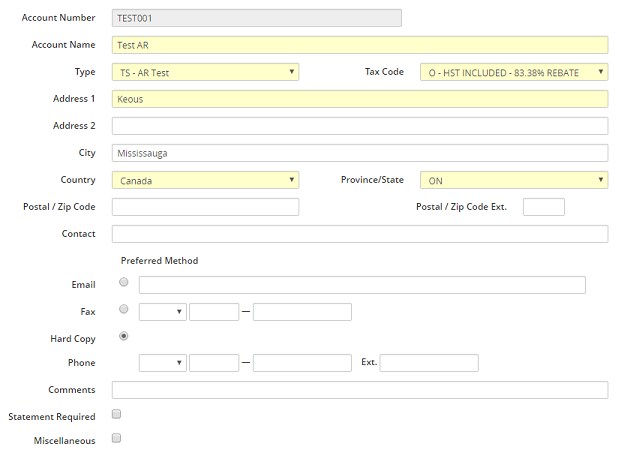 A/R account information may be updated as required. Once the customer account number has been assigned, it cannot be changed. The account number would have to be deleted and the A/R account added with the new number.