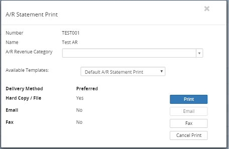 5. If applicable, in the A/R Statement Print dialog box, click on the A/R Revenue Category drop-down menu to select an option.
