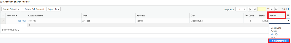 4. Click on the Action drop-down menu beside the corresponding A/R account and select Print Statement.